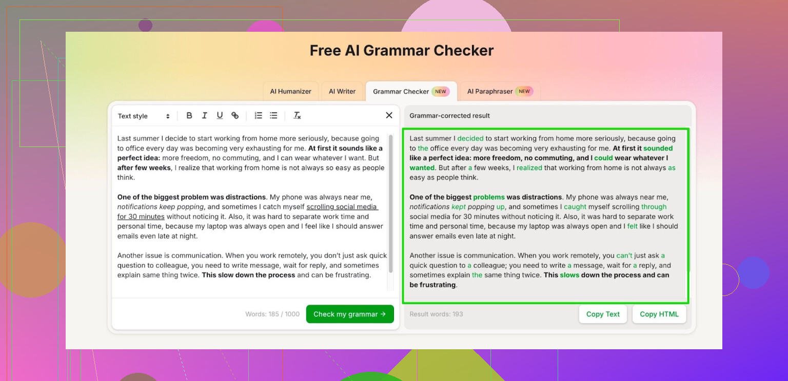 Aquí es donde algo como Clever AI Humanizer Free AI Grammar Checker resulta realmente útil. No solo detecta comas que faltan; ajusta las expresiones para que suenen a un inglés más normal y fluido, pero te permite mantener tu propio estilo si eres selectivo con lo que aceptas.